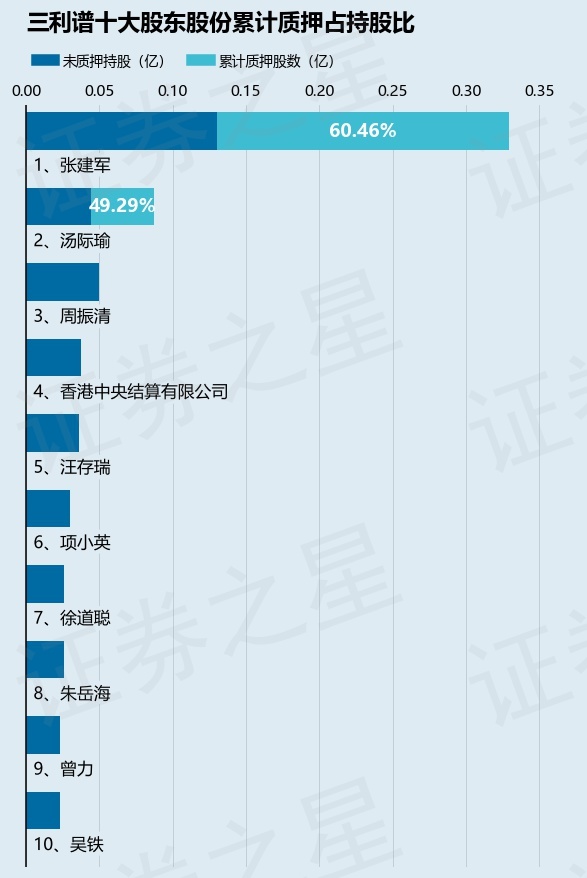 截止本公告日,股东张建军已累计质押股份1989.0万股,占其持股总数的60.46%,股东汤际瑜已累计质押股份431.0万股,占其持股总数的49.29%。本次质押后三利谱十大股东的累计质押股份占持股比例(占持股比例的计算以公司最新一期财务报表公布的十大股东的持股总数为基准)见下图:
