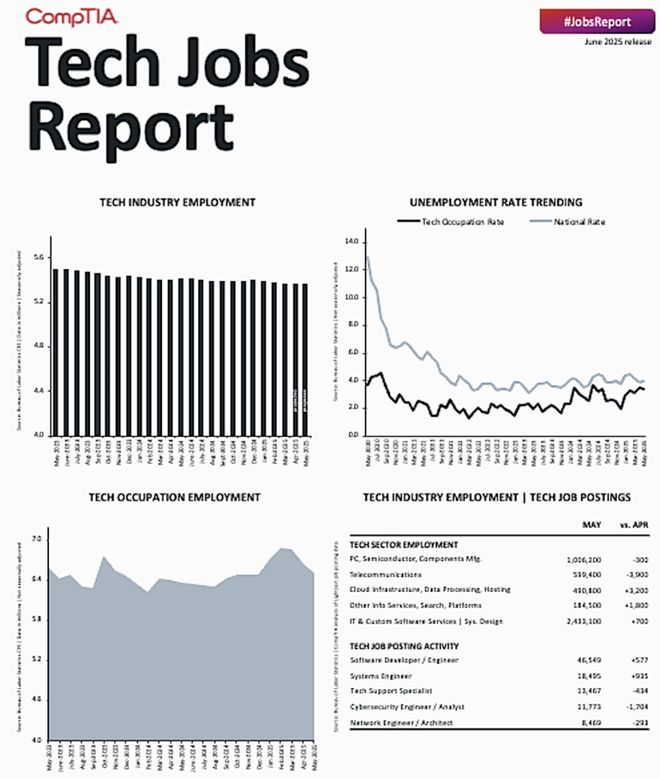 CompTIA对美国劳工统计局就业报告的分析显示,5月科技企业净增雇员仅1,571人。