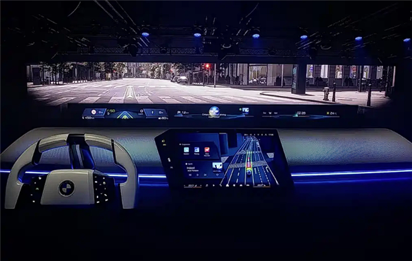 进入车内,也能看到非常多的创新之处,其将会首搭全景iDrive视平线全景显示投影,有点类似小米YU7的“天际屏”。
