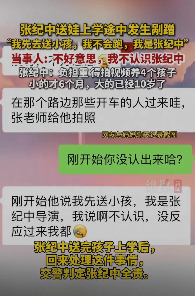 张纪中在把孩子送到学校之后,又回来处理了这件交通事故,判定,张纪中是全责。