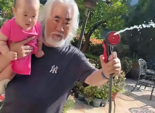 73岁的张导一手抱着粉嘟嘟的小女儿,一手拿着水管,脸上洋溢着慈祥的笑容。