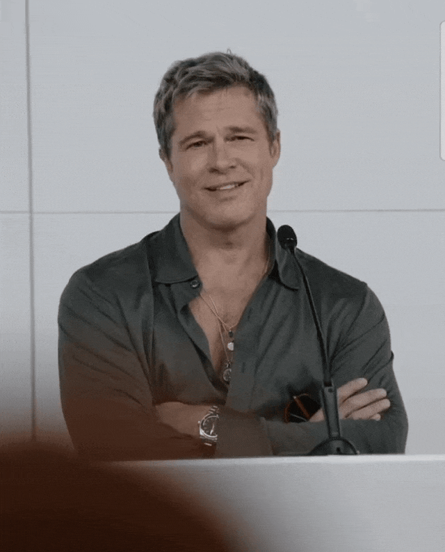 皮特饰演的F1赛车手桑尼·海耶斯,虽然官方吐槽“那个金发老头”“老年人再就业”“上世纪末的老人”,但他一出场,分明听到电影院里倒吸一口气~